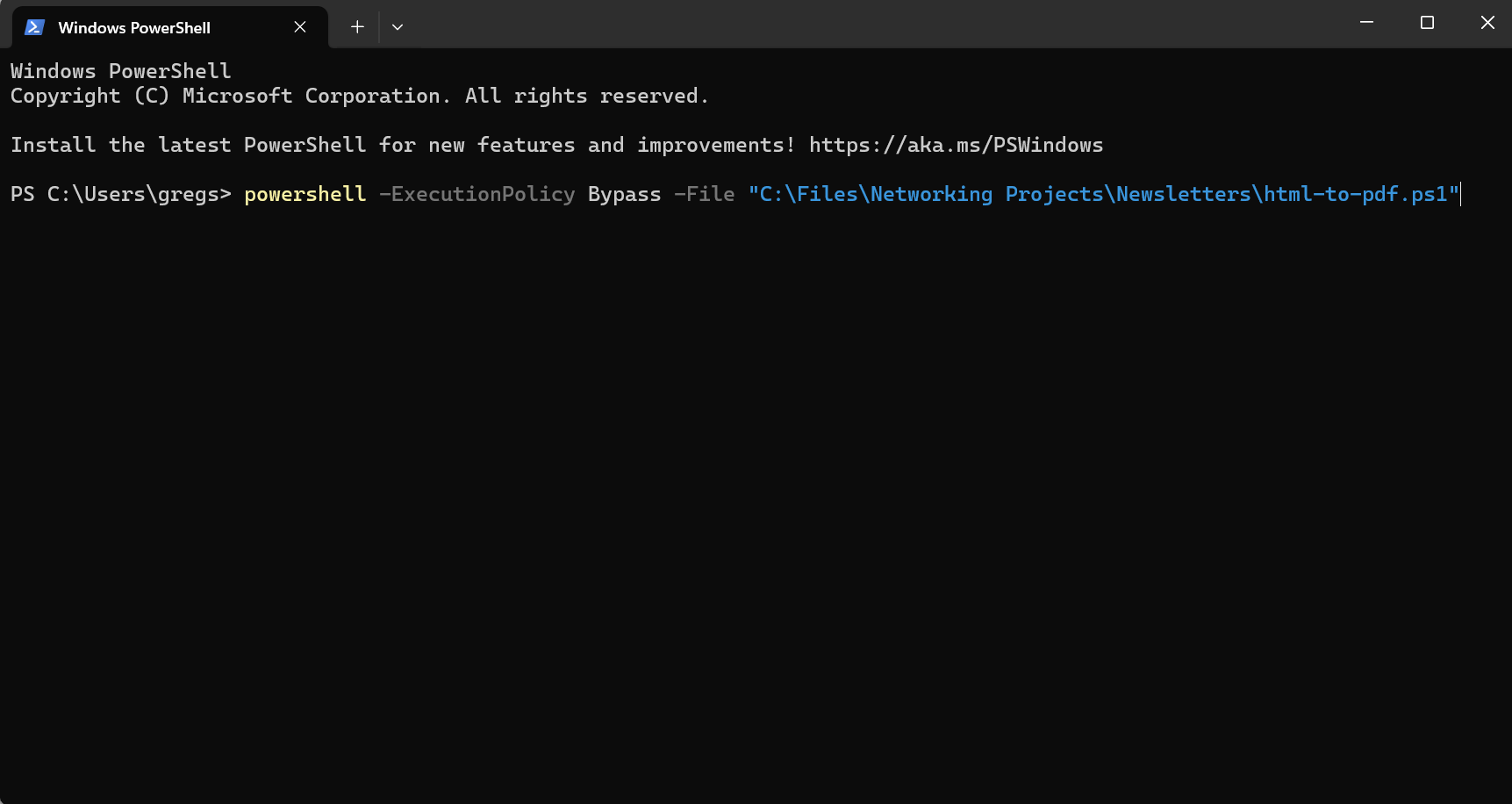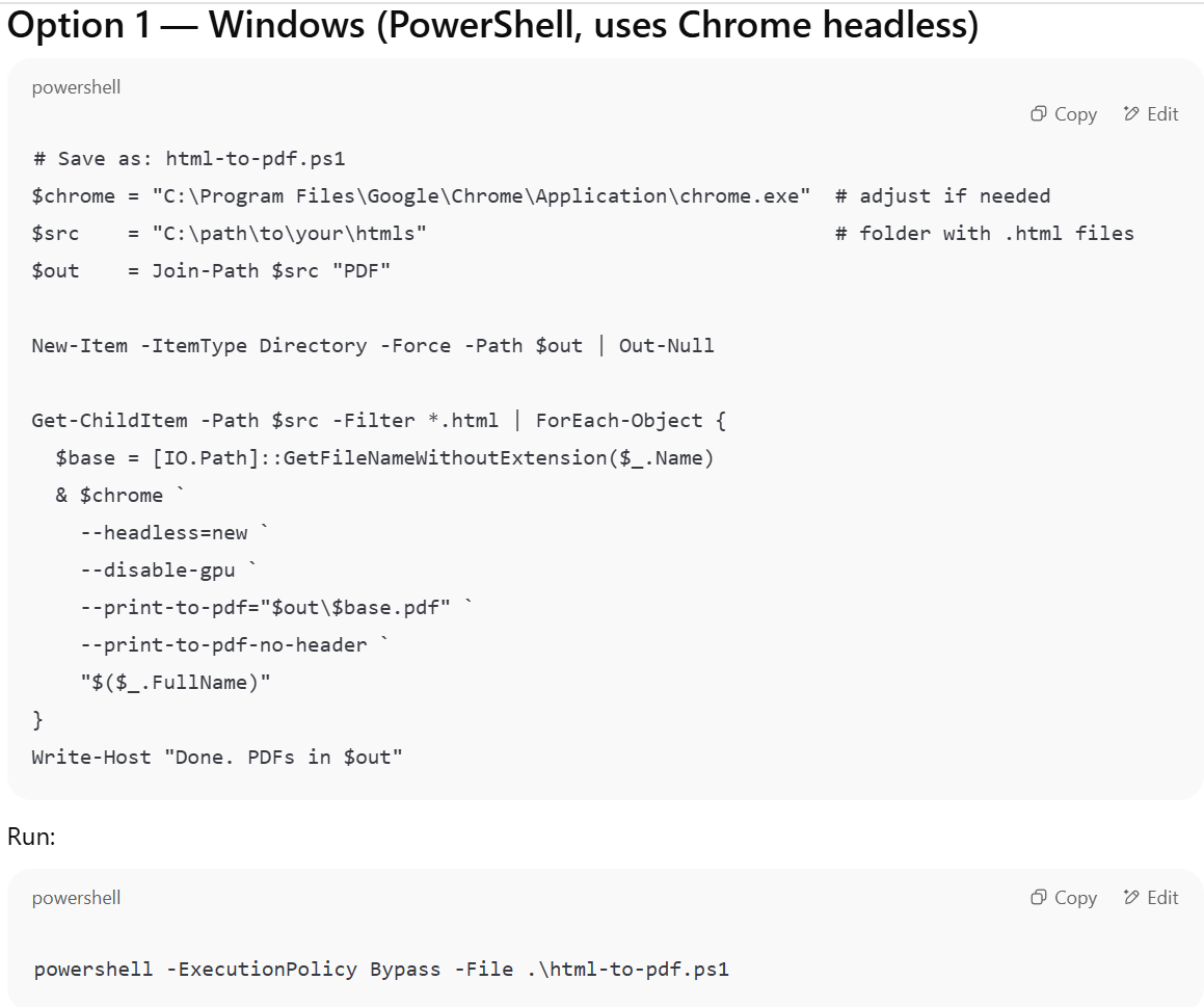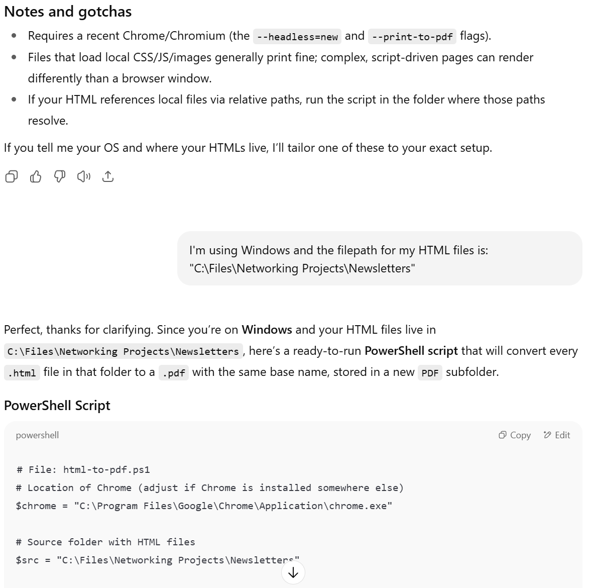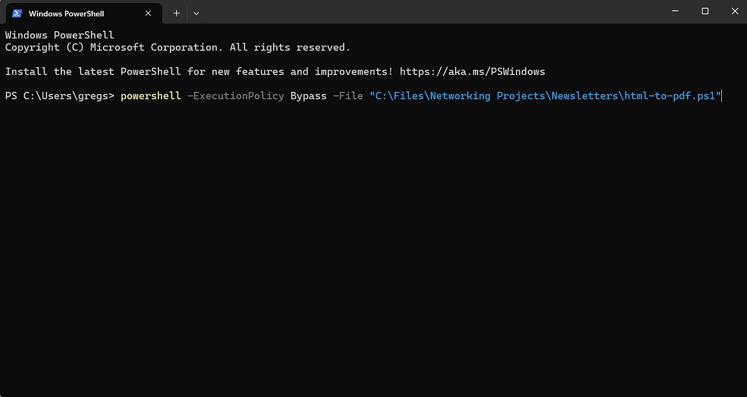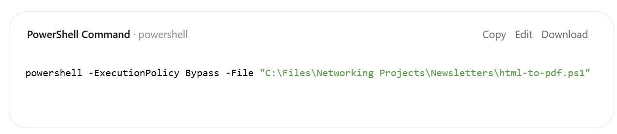 Copy the command ChatGPT gives you to run the script. Notice how ps1 file I saved is in the same folder where the HTML newsletters are stored (green text). Click Copy.