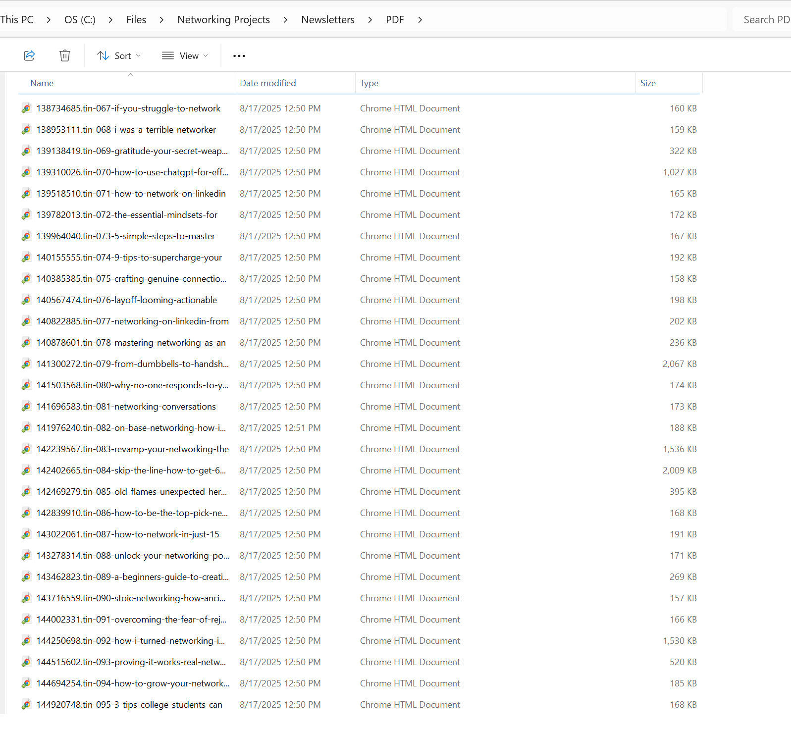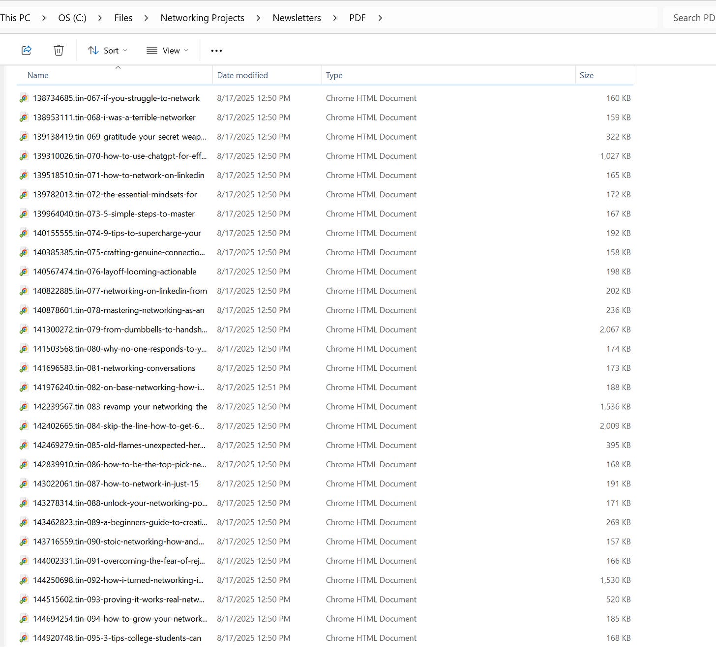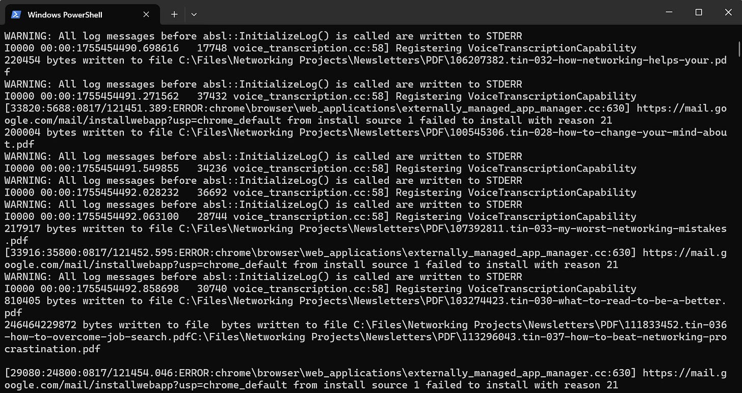 It took a few minutes to run. But when it was done, I had all my newsletters in a new folder called “PDF” in the same folder where all the HTML documents had been located. The file Type still says Chrome HTML Document, but when you open these, they open as PDFs. More importantly, I was able to upload them to NotebookLM as PDFs.