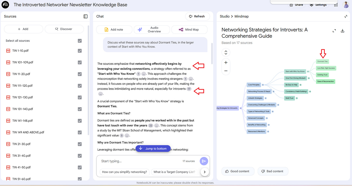 I love the Mind Map because it organizes all my topics and ideas into groups. Then when you click on one of the boxes, Notebook LM gives you a summary of the information with links back to the sources.