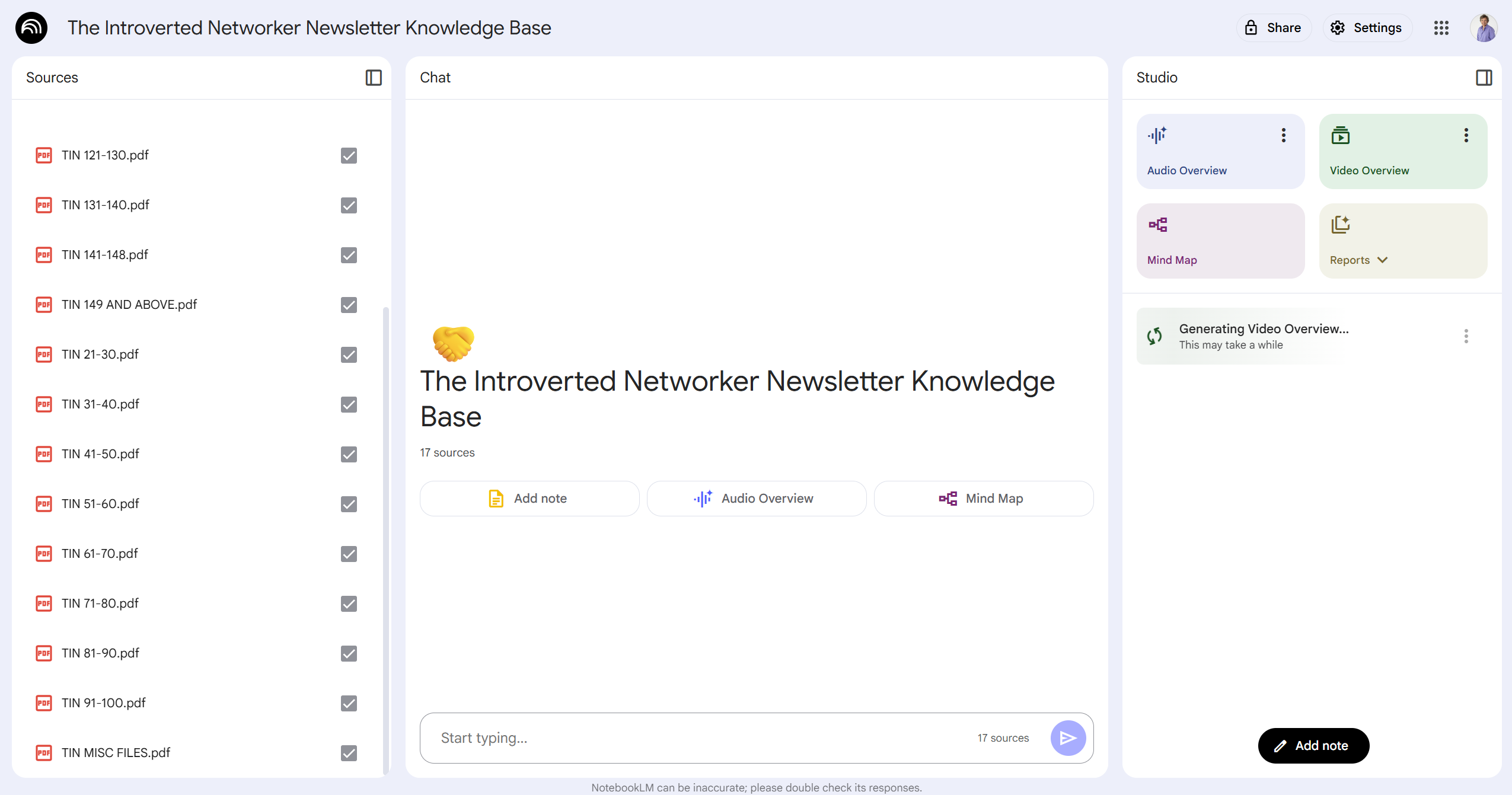 At this point, I had 150+ PDF files. The next obstacle: NotebookLM’s free version only allows 50 files per notebook. There are options to upgrade at a cost, but I stayed with the free version.