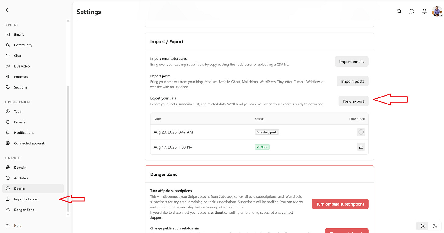 The first step was to get my data out of Substack. There’s a way to do this, but it’s not obvious.