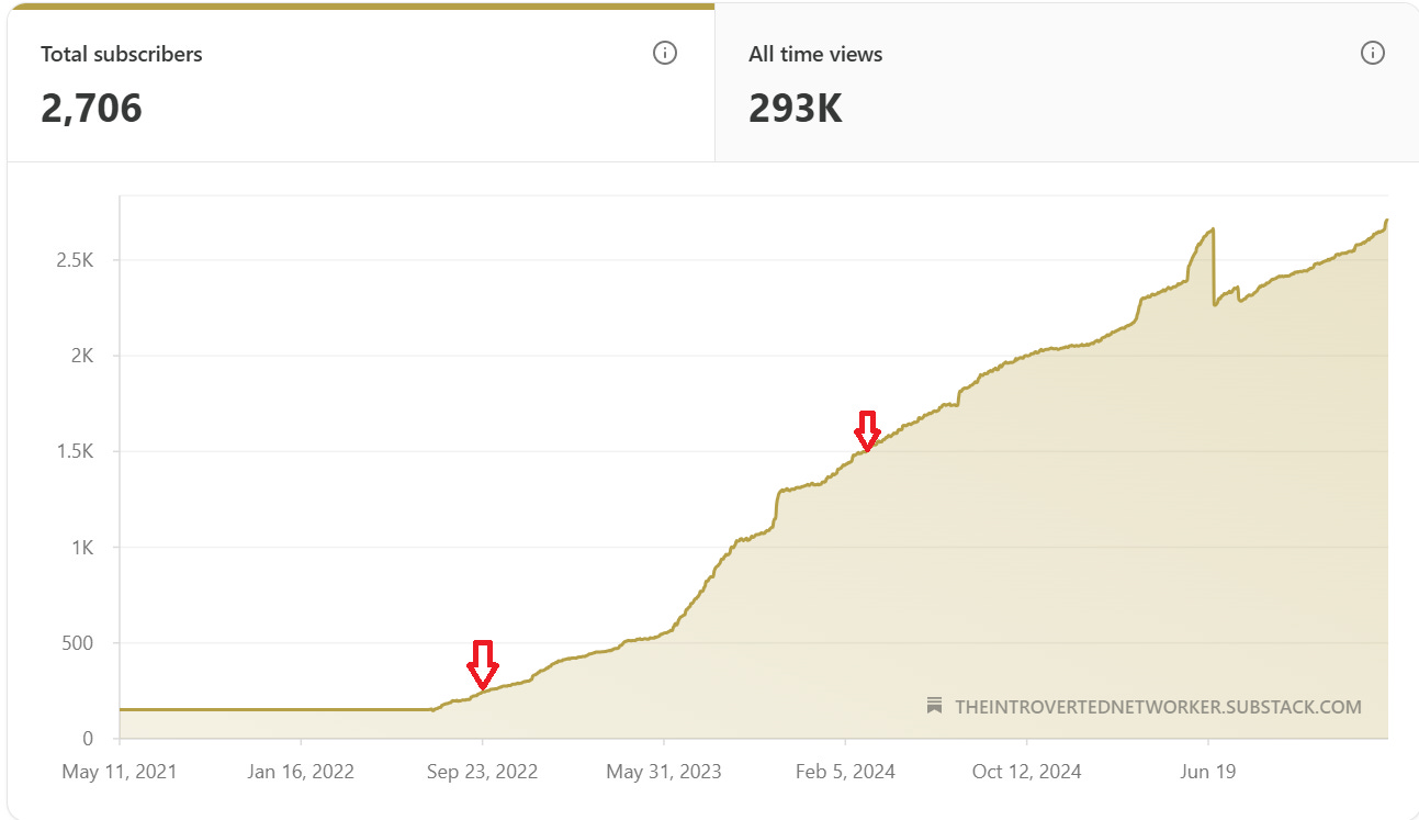 The first red arrow indicates when I wrote a three-part series on using LinkedIn for networking.